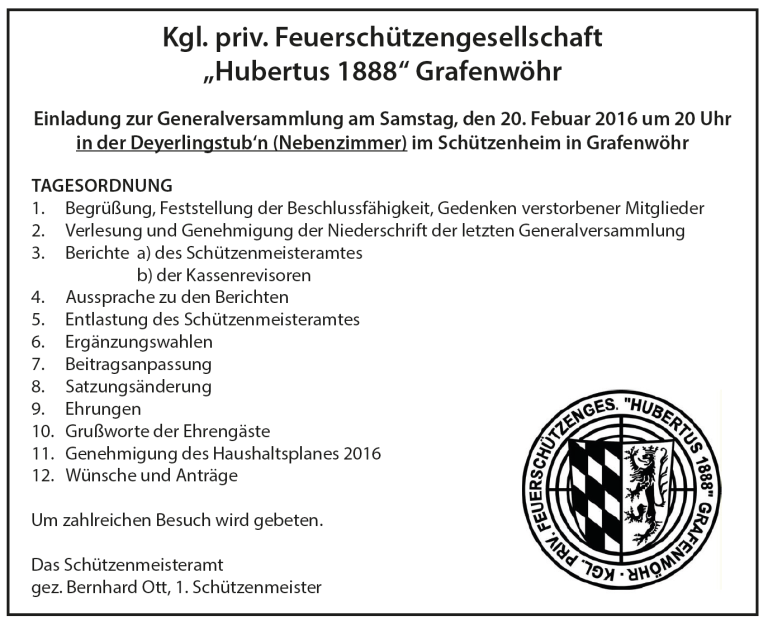 Einladung zur Generalversammlung am Samstag, den 20. Febuar 2016 um 20 Uhr in der Deyerlingstub‘n (Nebenzimmer) im Schützenheim in Grafenwöhr TAGESORDNUNG Begrüßung, Feststellung der Beschlussfähigkeit, Gedenken verstorbener Mitglieder Verlesung und…