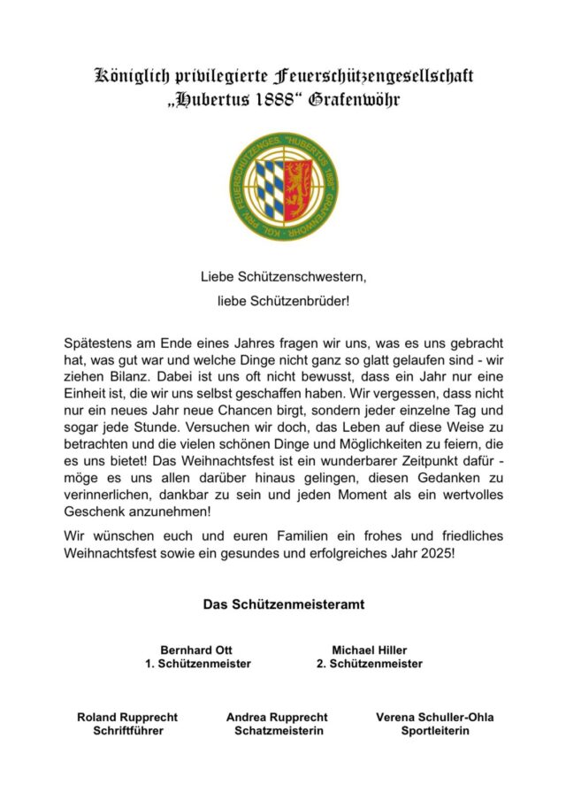 Einladung zur Generalversammlung am Samstag, den 8. Februar 2025 um 20 Uhr im Schützenheim in Grafenwöhr TAGESORDNUNG 1. Begrüßung, Feststellung der Beschlussfähigkeit, Gedenken verstorbener Mitglieder 2. Verlesung und Genehmigung der Niederschrift der letzten Generalversammlung 3. Berichte a) des Schützenmeisteramtes b) der Kassenrevisoren 4. Aussprache zu den Berichten 5. Entlastung des Schützenmeisteramtes 6. Ergänzungswahlen 7.…